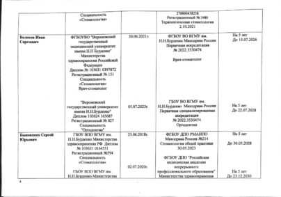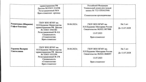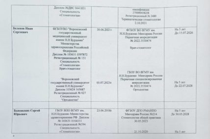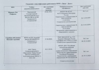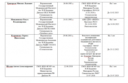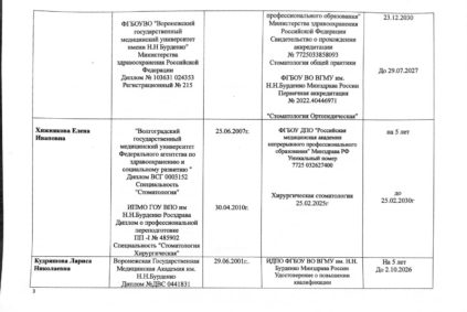 Главным нашим достоянием мы считаем высокую квалификацию работающих у нас специалистов. В нашей клинике работают врачи, которые являются профессионалами самого высокого уровня. Их практический опыт был приобретен в ведущих стоматологических клиниках Германии, Москвы, Казани. При этом они постоянно совершенствуют свою квалификацию и проходят обучение, как в России, так и в зарубежных странах, что подтверждается наличием многочисленных дипломов и сертификатов.